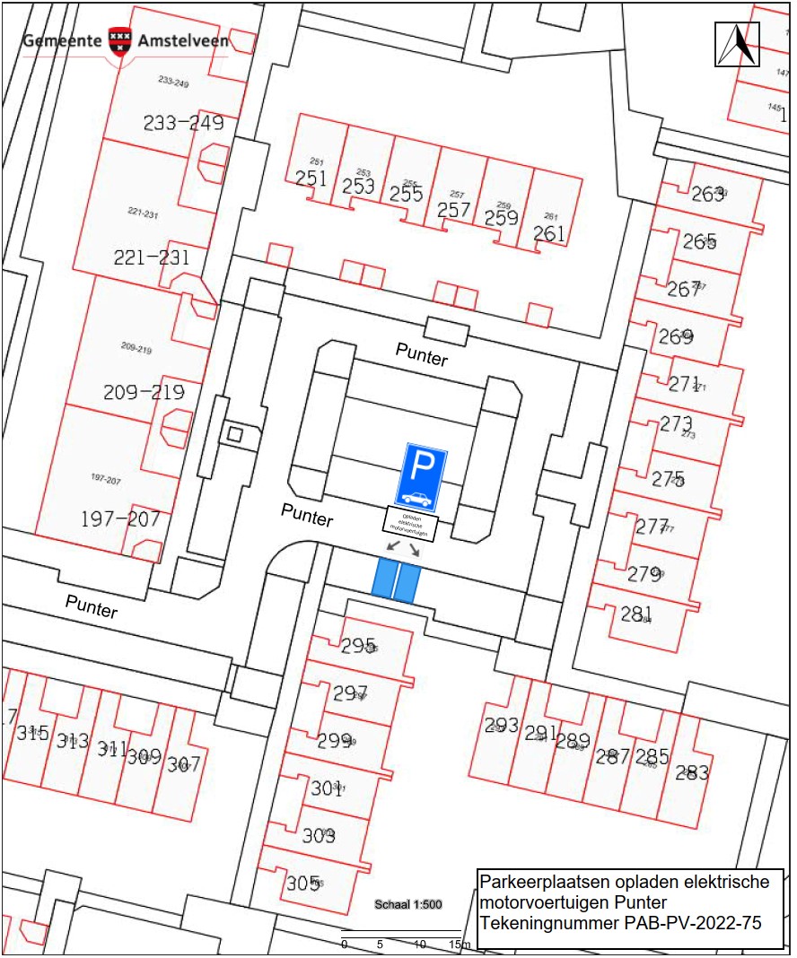 Burgemeester en wethouders van Amstelveen besluiten om in de straat Punter twee parkeerplaatsen aan te wijzen als parkeerplaats voor het opladen van elektrische motorvoertuigen. De parkeerplaatsen mogen alleen gebruikt worden voor het opladen van deze elektrische motorvoertuigen.