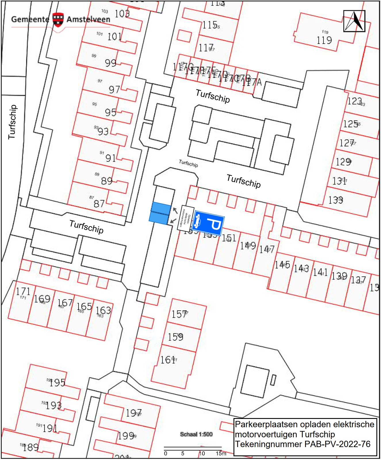 Burgemeester en wethouders van Amstelveen besluiten om in de straat Turfschip twee parkeerplaatsen aan te wijzen als parkeerplaats voor het opladen van elektrische motorvoertuigen. De parkeerplaatsen mogen alleen gebruikt worden voor het opladen van deze elektrische motorvoertuigen.