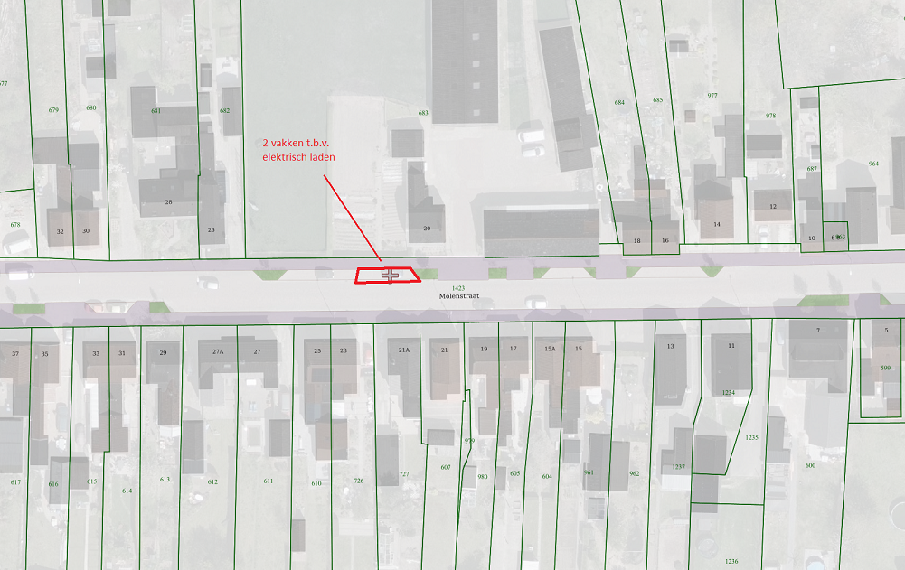 tot het aanwijzen van de volgende parkeervakken, uitsluitend voor elektrische personenauto's, nabij het aan te brengen oplaadpunt op de 2 op tekening aangegeven vakken van de parkeerstrook aan de noordzijde van de Molenstraat te Clinge, nabij woning nummer 20, middels plaatsing van bord E08 “laden elektrische auto” en onderbord OB504 van bijlage I behorende bij het ‘Reglement Verkeersregels en Verkeerstekens 1990’.