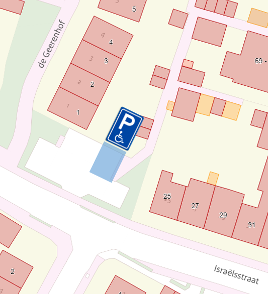 Indicatie van de te plaatsen gehandicaptenparkeerplaats op de locatie.