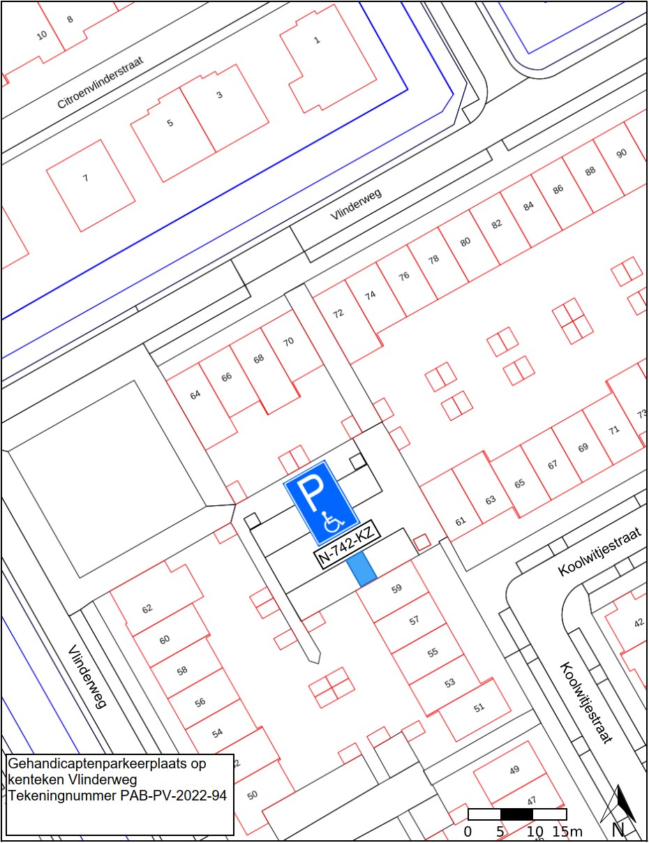 Burgemeester en wethouders van Aalsmeer besluiten het parkeren te verbieden op een parkeerplaats op een parkeerterrein aan de Vlinderweg, zoals aangegeven op tekening PAB-PV-2022-94, met uitzondering van het voertuig met het kenteken N-742-KZ (gehandicaptenparkeerplaats).