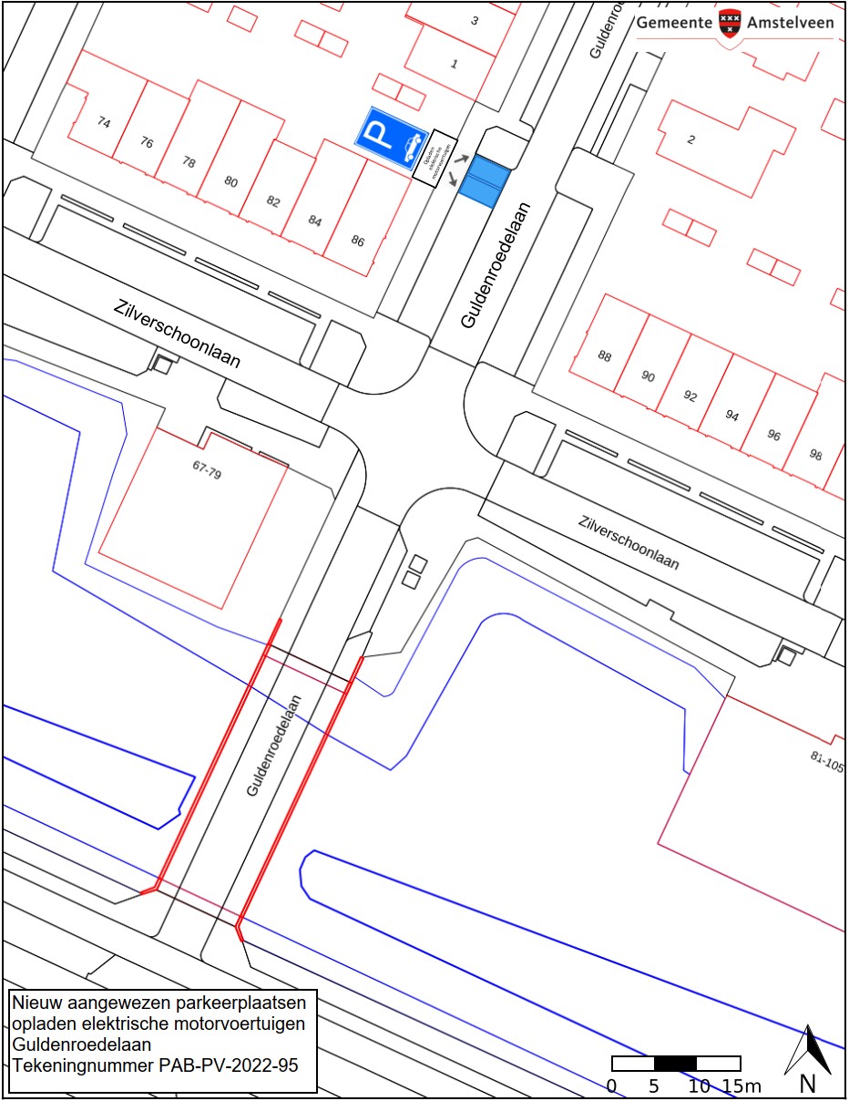 Burgemeester en wethouders van Amstelveen besluiten daarnaast om op een andere locatie in de Guldenroedelaan twee parkeerplaatsen aan te wijzen als parkeerplaats voor het opladen van elektrische motorvoertuigen. De parkeerplaatsen mogen alleen gebruikt worden voor het opladen van deze elektrische motorvoertuigen.