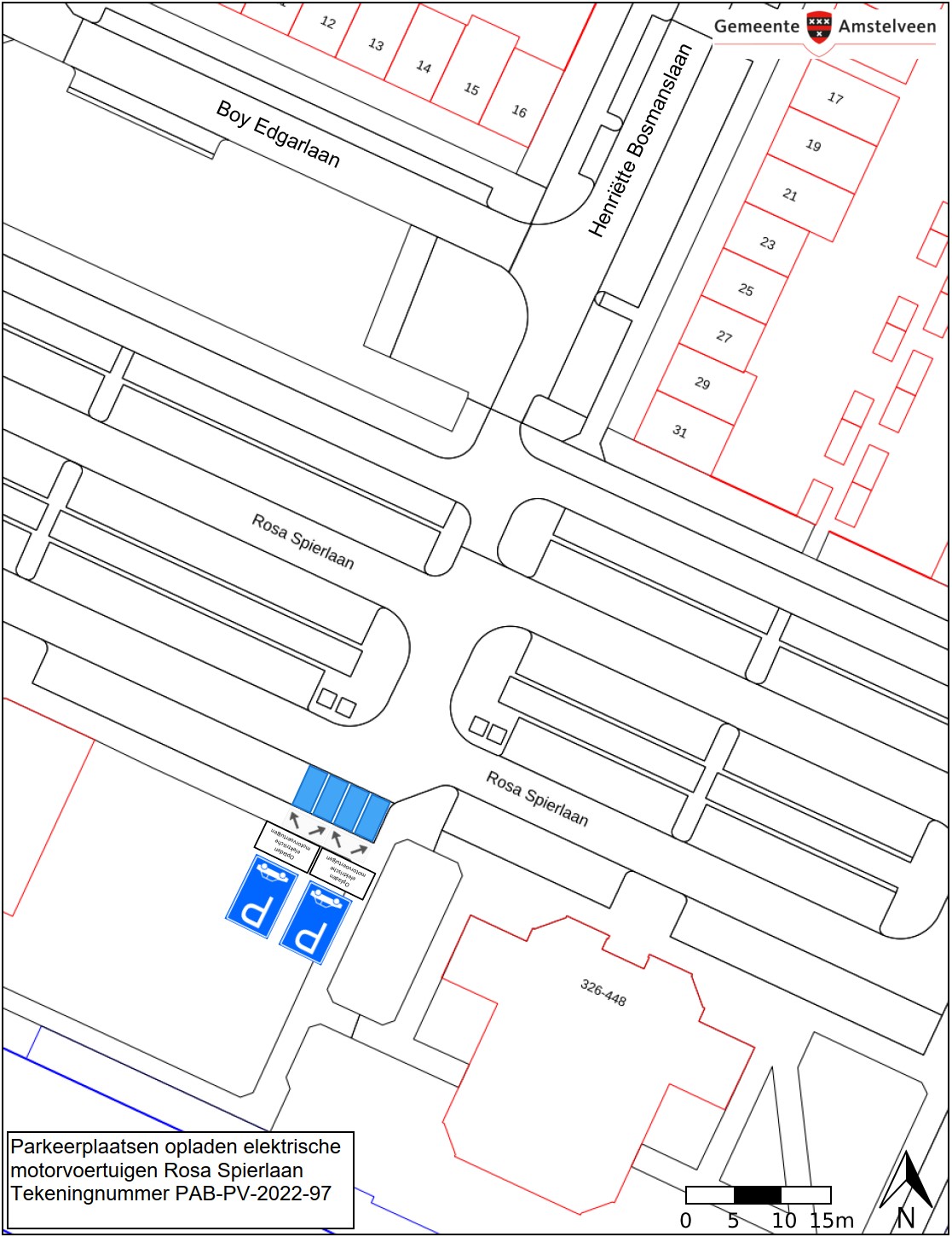 Burgemeester en wethouders van Amstelveen besluiten om in de Rosa Spierlaan vier parkeerplaatsen aan te wijzen als parkeerplaats voor het opladen van elektrische motorvoertuigen. De parkeerplaatsen mogen alleen gebruikt worden voor het opladen van deze elektrische motorvoertuigen.