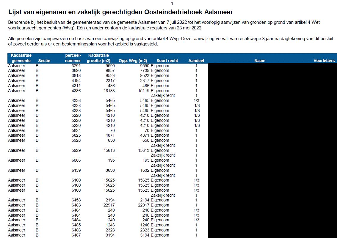 De eigenaren en beperkt gerechtigden van deze percelen ontvangen ieder afzonderlijk, per aangetekende brief, bericht over de inhoud van dit besluit en de gevolgen hiervan. Het besluit met de kaart en de lijst van aangewezen gronden, ligt gedurende zes weken, van 13 juli tot en met 24 augustus 2022, ter inzage bij de balie 5/receptie in het raadhuis aan het Raadhuisplein 1 te Aalsmeer. (zie voor openingstijden www.aalsmeer.nl).
