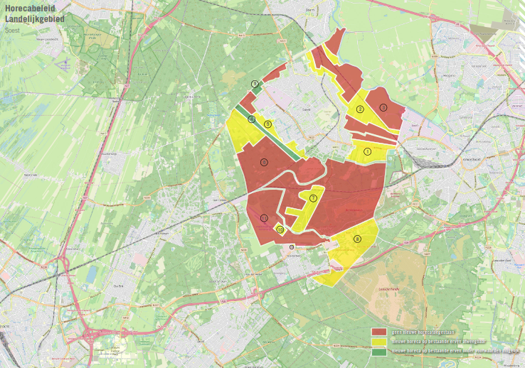 In het buitengebied worden verschillende gebieden onderscheiden. Dit zijn gebieden die ruimtelijk en landschappelijk van elkaar te onderscheiden zijn, waarvoor in de Structuurvisie Soest en de Gebiedsvisie Landelijk Gebied onderscheidende beleidskoersen zijn vastgesteld en waar verschillende omgevingswaarden een rol spelen. Met dit nieuwe beleid hebben we juist een onderscheid gemaakt in verschillende natuurgebieden dan wel doorgaande wegen elk met eigen horecamogelijkheden en afgestemd op de daar voorkomende recreatiedruk (zoals verwoord in het stoplichtmodel vanaf pagina 9 en verder). Onzes inziens gaan recreanten/toeristen die gaan recreëren (fietsen, wandelen etc.) vaak een horecagelegenheid opzoeken. De zonering is hier wel op afgestemd: in de natuurgebieden met veel natuurwaarden wordt geen verdere horeca toegestaan. Wel is horeca mogelijk bij de TOP locaties en aan de randen van de natuurgebieden waar al infrastructuur aanwezig is. Op basis van de uitgangspunten is een stoplicht model uitgewerkt als afwegingskader voor horeca in het landelijk gebied. Dit stoplicht is vertaald naar een kaart. Het stoplichtmodel is op de volgende afweging gebaseerd: