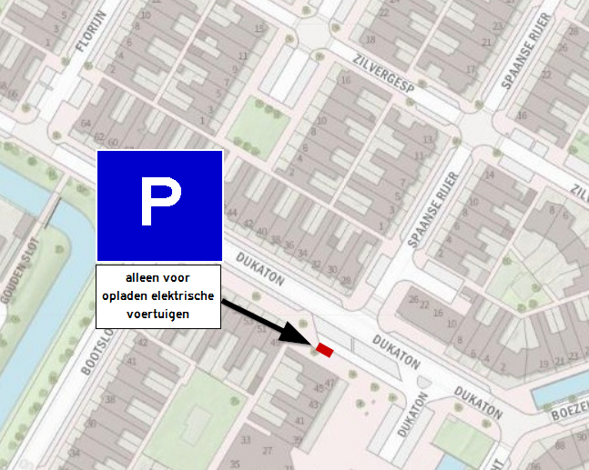 De twee parkeervakken in de Dukaton, ter hoogte van huisnummer 49, aangegeven in de onderstaande afbeelding, aan te wijzen en te reserveren ten behoeve van het opladen van elektrische voertuigen; en