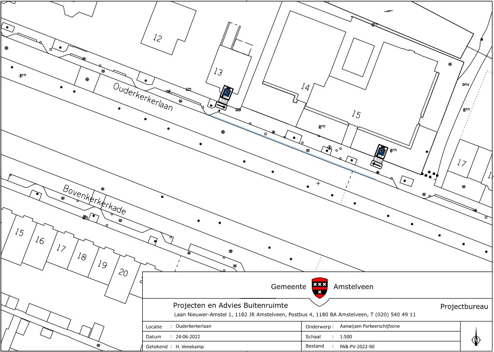 Burgemeester en wethouders van Amstelveen besluiten om de parkeervakken in een parkeerstrook gelegen voor een cultureel wijkcentrum aan de Ouderkerkerlaan aan te wijzen als parkeerschijfzone, zoals aangegeven op tekening PAB-PV-2022-90.