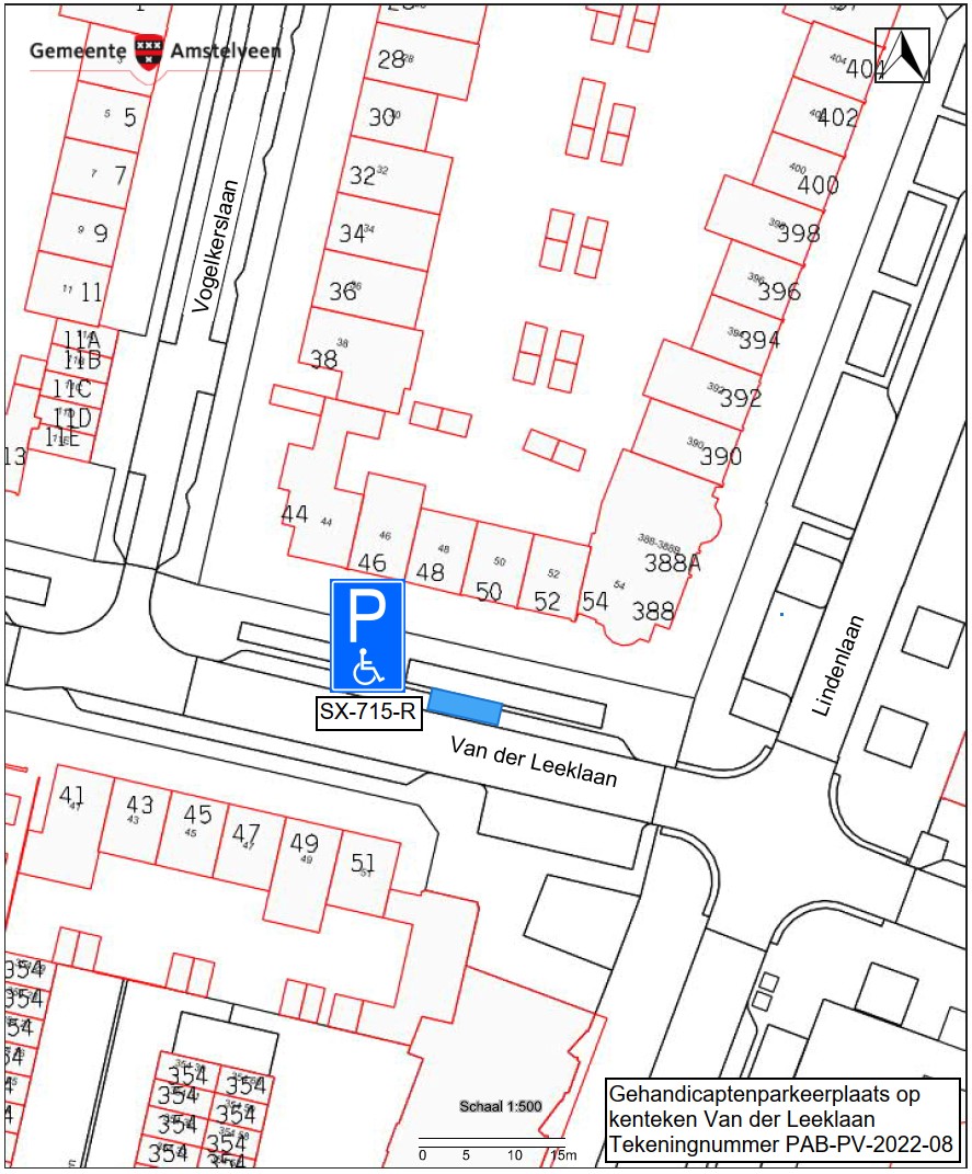 Burgemeester en wethouders van Amstelveen besluiten het parkeren te verbieden op een parkeerplaats in de Van der Leeklaan, zoals aangegeven op tekening PAB-PV-2022-08, met uitzondering van het voertuig met het kenteken SX-715-R (gehandicaptenparkeerplaats).