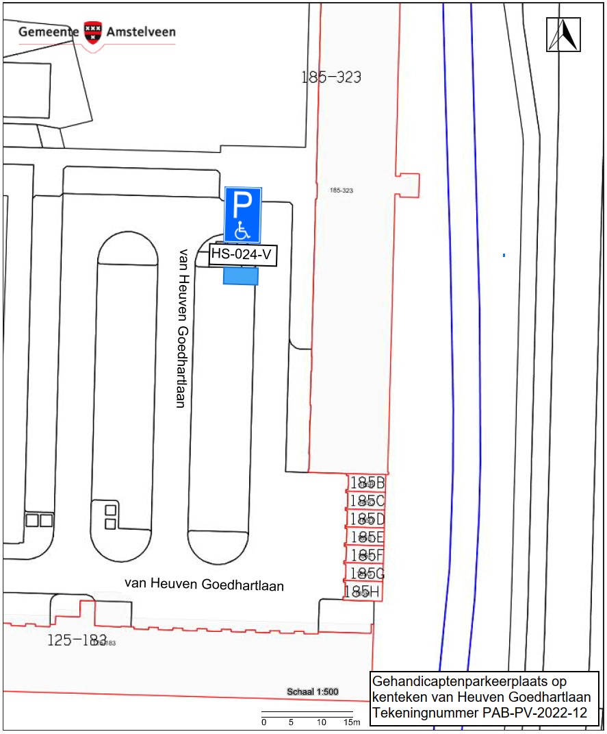 Burgemeester en wethouders van Amstelveen besluiten het parkeren te verbieden op een parkeerplaats aan de Van Heuven Goedhartlaan, zoals aangegeven op tekening PAB-PV-2022-12, met uitzondering van het voertuig met het kenteken HS-024-V (gehandicaptenparkeerplaats).