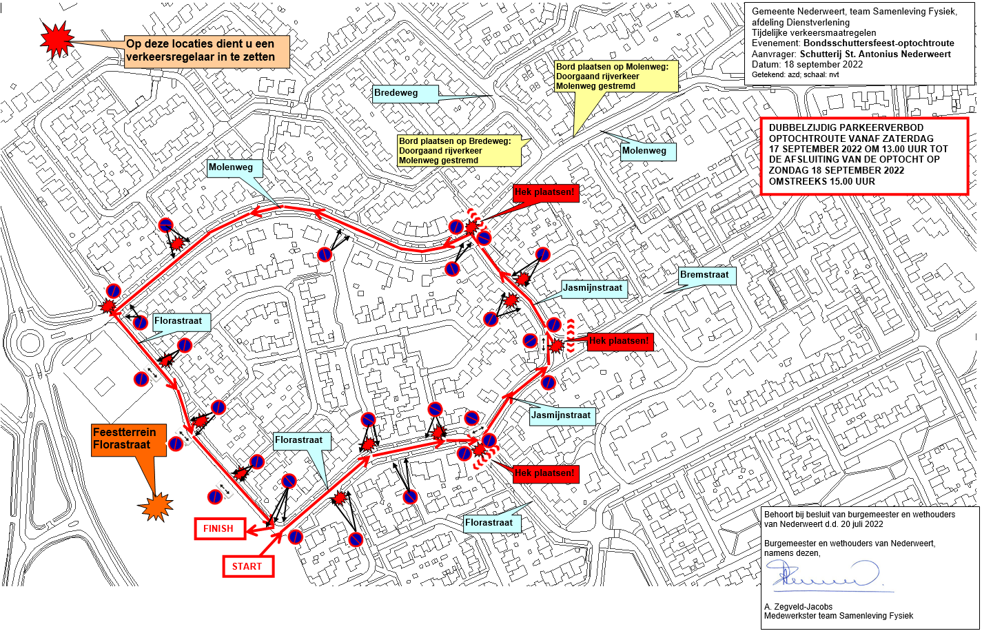 De optochtroute Florastraat – Jasmijnstraat – Molenweg – Florastraat door middel van hekken en verkeersregelaars af te sluiten voor alle verkeer behalve voetgangers voor de duur van de optocht.
