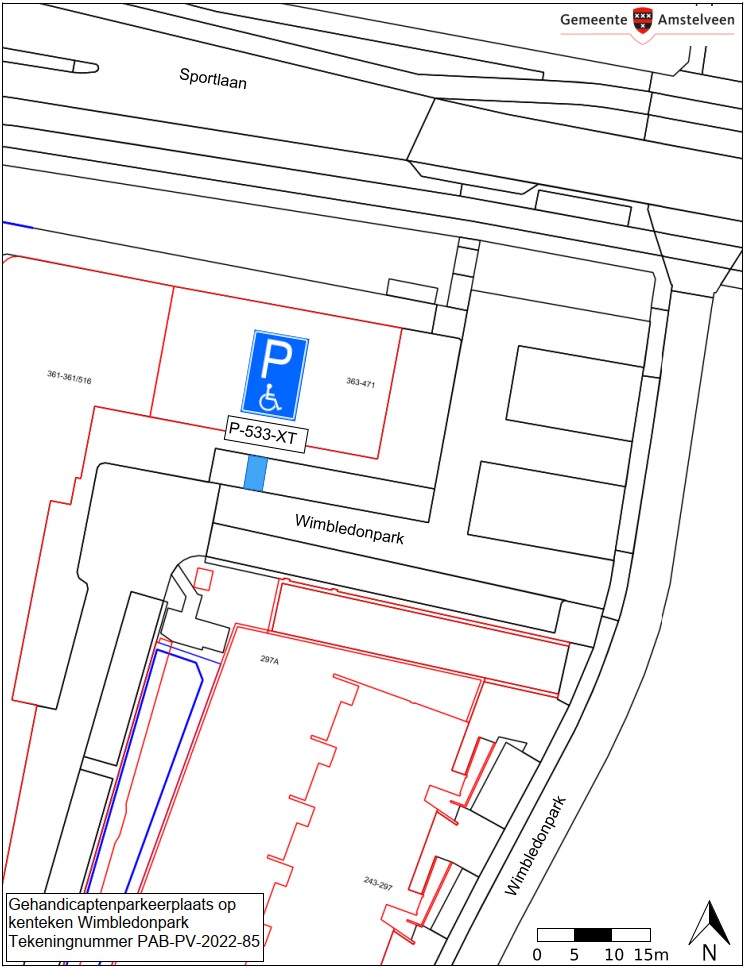 Burgemeester en wethouders van Amstelveen besluiten het parkeren te verbieden op een parkeerplaats op het parkeerterrein in het noordelijke deel van Wimbledonpark, zoals aangegeven op tekening PAB-PV-2022-85, met uitzondering van het voertuig met het kenteken P-533-XT (gehandicaptenparkeerplaats).