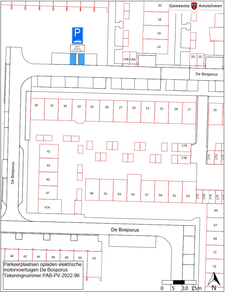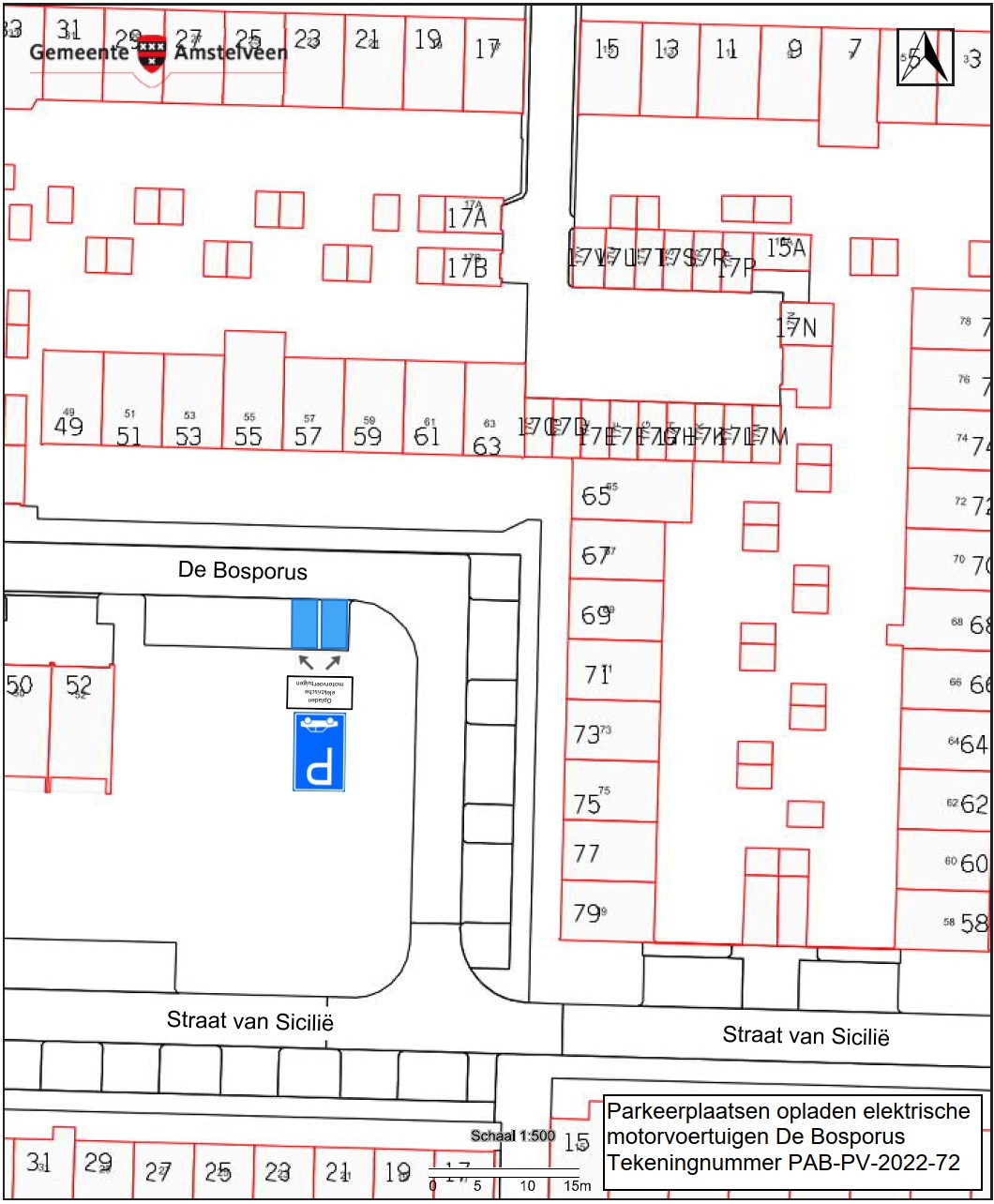 Burgemeester en wethouders van Amstelveen besluiten daarnaast om op een andere locatie in de straat De Bosporus twee parkeerplaatsen aan te wijzen als parkeerplaats voor het opladen van elektrische motorvoertuigen. De parkeerplaatsen mogen alleen gebruikt worden voor het opladen van deze elektrische motorvoertuigen.