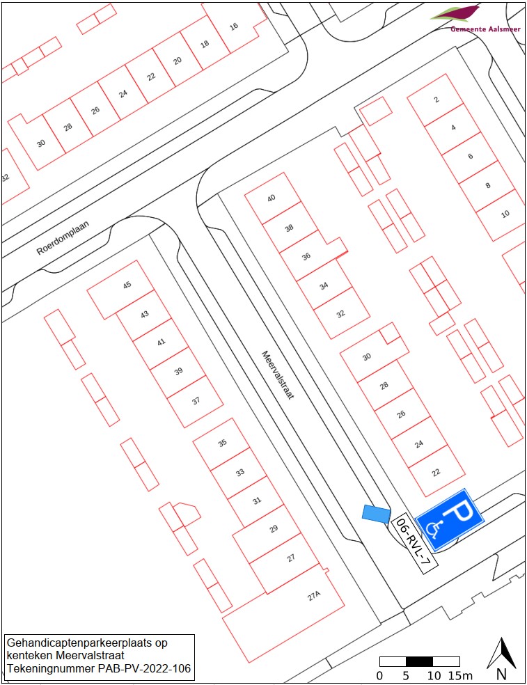 Burgemeester en wethouders van Aalsmeer besluiten het parkeren te verbieden op een parkeerplaats in de Meervalstraat, zoals aangegeven op tekening PAB-PV-2022-106, met uitzondering van het voertuig met het kenteken 06-RVL-7 (gehandicaptenparkeerplaats).
