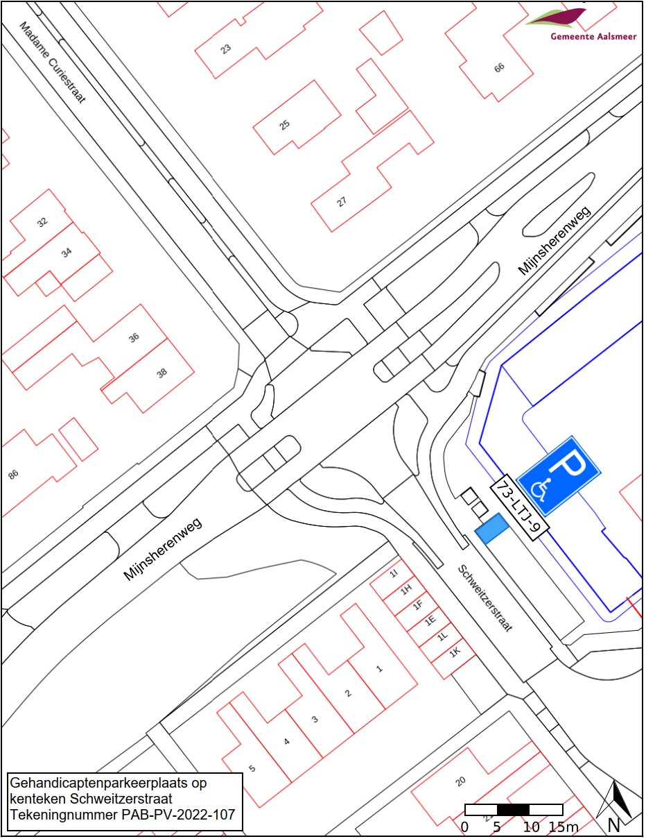 Burgemeester en wethouders van Aalsmeer besluiten het parkeren te verbieden op een parkeerplaats in de Schweitzerstraat, zoals aangegeven op tekening PAB-PV-2022-107, met uitzondering van het voertuig met het kenteken 73-LTJ-9 (gehandicaptenparkeerplaats).