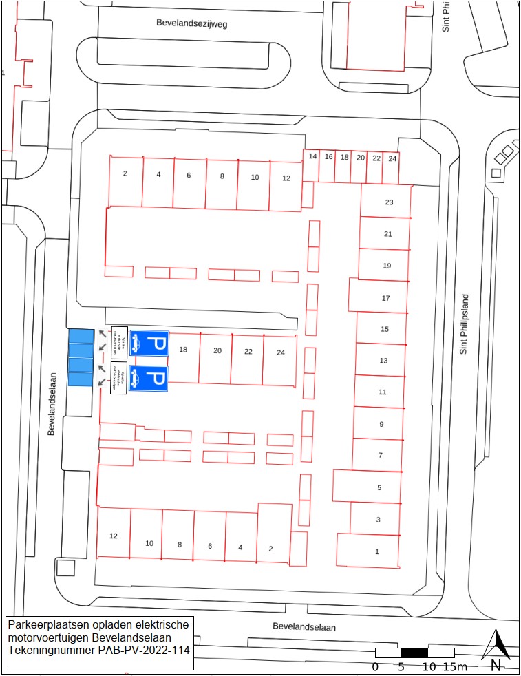 Dit gebeurt door het plaatsen van borden E8 van bijlage 1 van het Reglement verkeersregels en verkeerstekens 1990 (RVV 1990) en onderborden met opschrift “opladen elektrische motorvoertuigen” en waarop is aangegeven dat de maatregel voor twee naast elkaar gelegen parkeerplaatsen geldt, zoals aangegeven op de bebordingstekening PAB-PV-2022-114.