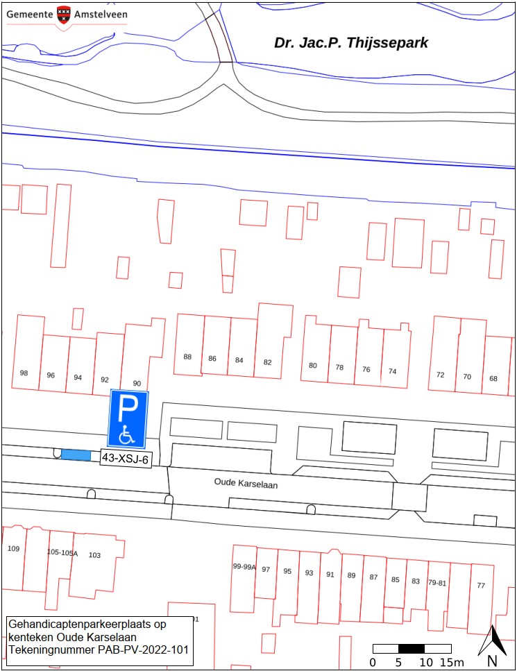 Burgemeester en wethouders van Amstelveen besluiten het parkeren te verbieden op een parkeerplaats in de Oude Karselaan, zoals aangegeven op tekening PAB-PV-2022-101, met uitzondering van het voertuig met het kenteken 43-XJS-6 (gehandicaptenparkeerplaats).