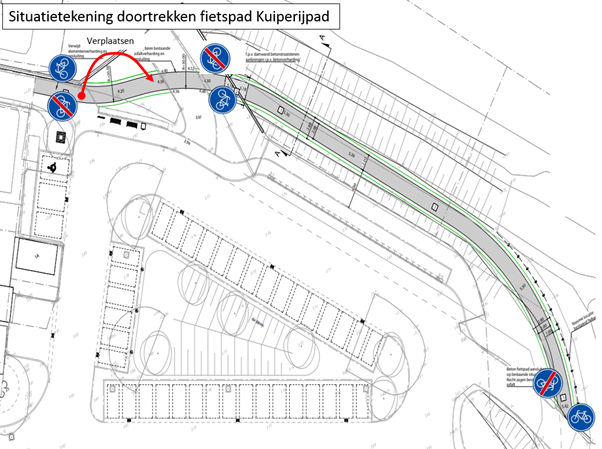 de aanleg van een fietspad op het dijklichaam echter geen garantie biedt dat fietsers de gebruikelijke route over het parkeerterrein niet meer zullen gaan gebruiken; ( het betreft in hoofdzaak plaatselijk bekend verkeer, de route via de parkeerplaats naar de uitgang is korter en deze route kan niet verboden worden door het nemen van een verkeersmaatregel);