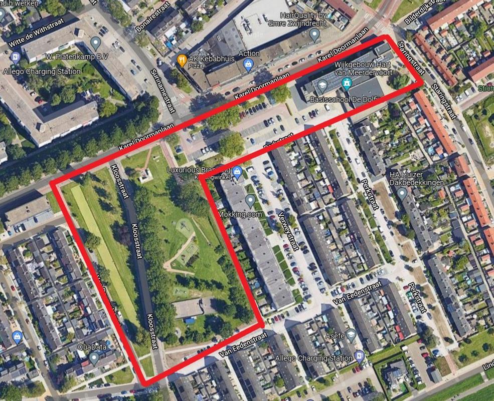 Gebied in Kort Ambacht – begrensd door de straten Van Deysselstraat – Nijhoffstraat – Van Eedenstraat – achterpad woningen Verweystraat – Perkstraat - Staringstraat - Karel Doormanlaan