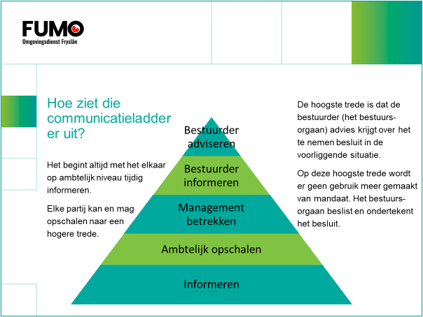 Bijzonderheden kunnen ook dusdanig zijn dat het verstandig wordt gevonden om ambtelijk op te schalen. Dit ambtelijk opschalen kan zowel binnen de FUMO als binnen de gemeenten, bijvoorbeeld door een andere collega (bijv. een jurist, specialist, communicatieadviseur) te betrekken.