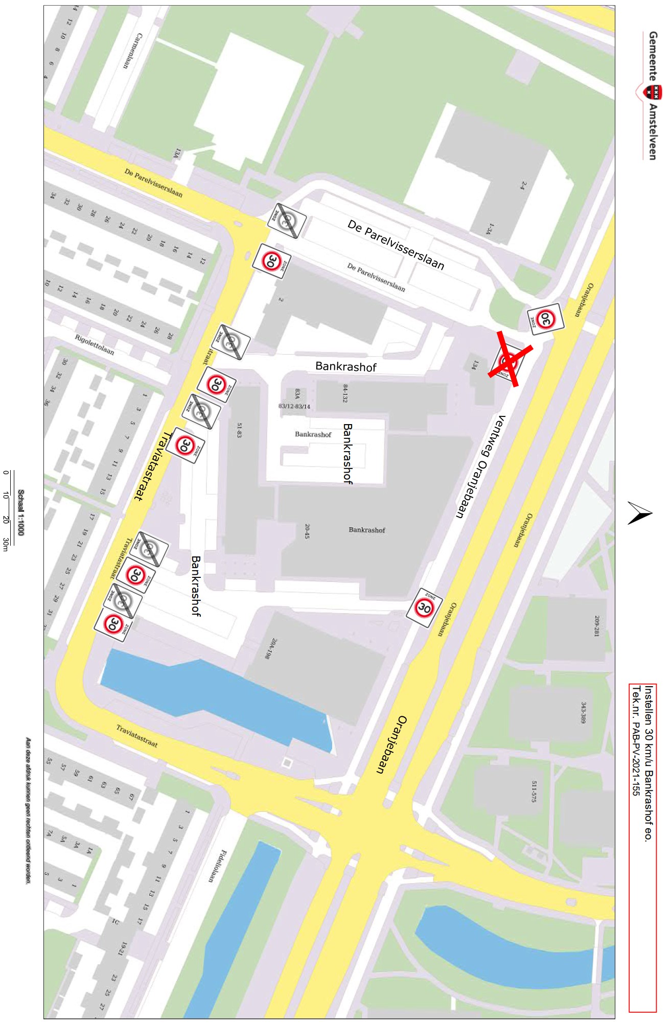 Burgemeester en wethouders van Amstelveen besluiten om het gebied waarin Bankrashof, de ventweg van de Oranjebaan gelegen aan de noordkant van het winkelcentrum Bankrashof en het gedeelte van de De Parelvisserslaan ten noorden van de Traviatastraat liggen aan te wijzen als 30 km/uurzone, zoals aangegeven op tekening PAB-PV-2021-155.