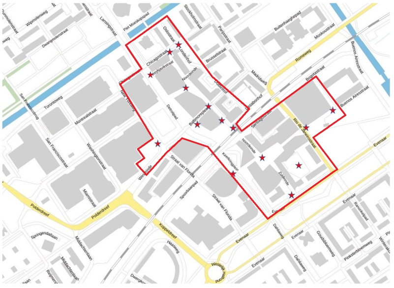 Het gebied, aangegeven op bijlage II van dit besluit en dat wordt omsloten/begrensd door Evenaar, Mathieu Cordangpad, Detroitpad, New Yorkweg, Chicagostraat, het water dat grenst aan het Piet Moeskopspad, Londenhof, Dublinhof, Santiagostraat, Bogotastraat, Rio de Janeiroplein en Rio de Janeirostraat, aan te wijzen als gebied waar vaste camera’s worden geplaatst van 1 februari 2022 tot 1 februari 2024 ten behoeve van de handhaving van de openbare orde;