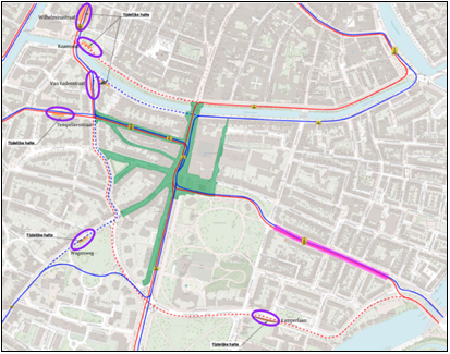 dat omleidingsroutes voor de bestaande buslijnen, die normaal gesproken leiden over Frederikspark, Houtplein en Tempeliersstraat, zijn vastgesteld;