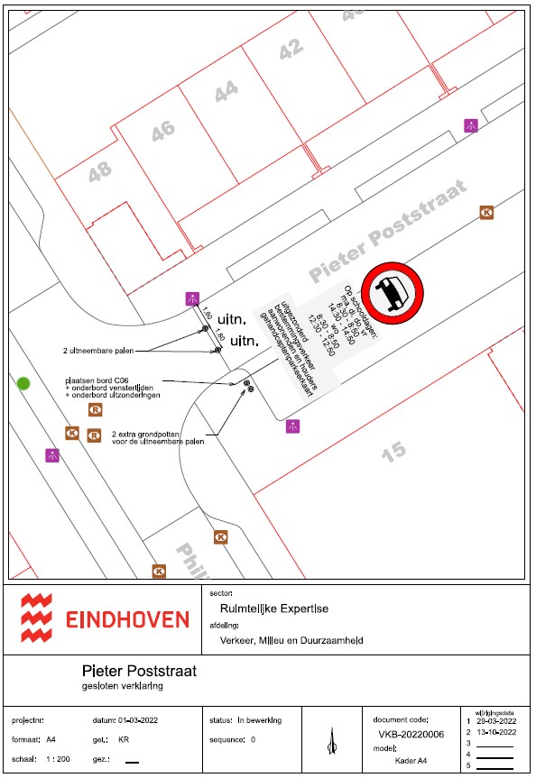 De maatregelen zijn aangegeven op tekening VKB-20220006, d.d. 01-03-2022, laatst gewijzigd op 13-10-2022 en worden uitgevoerd door plaatsing van 2 uitneembare palen en het bord C06, met onderbord ‘op schooldagen: ma-di-do-vr 08.30 - 08.50 en 14.30 - 14.50 en wo 08.30 - 08.50 en 12.30 - 12.5’ en onderbord ‘uitgezonderd bestemmingsverkeer aanwonenden en houders gehandicaptenparkeerkaart’.