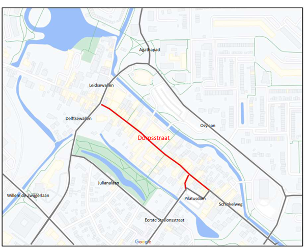 door plaatsing van borden G7 en G8 van bijlage 1 van het RVV 1990, met daarop de vermelding “zone” als vermeld in artikel 9 van het BABW inzake het wegverkeer, een voetgangerszone in te stellen op het gedeelte van de Dorpsstraat dat gelegen is tussen Pilatusdam en de kruising Dorpsstraat – Leidsewallen – Delftsewallen en op het gedeelte van de Eerste Stationsstraat gelegen tussen Pilatusdam en de Dorpsstraat;