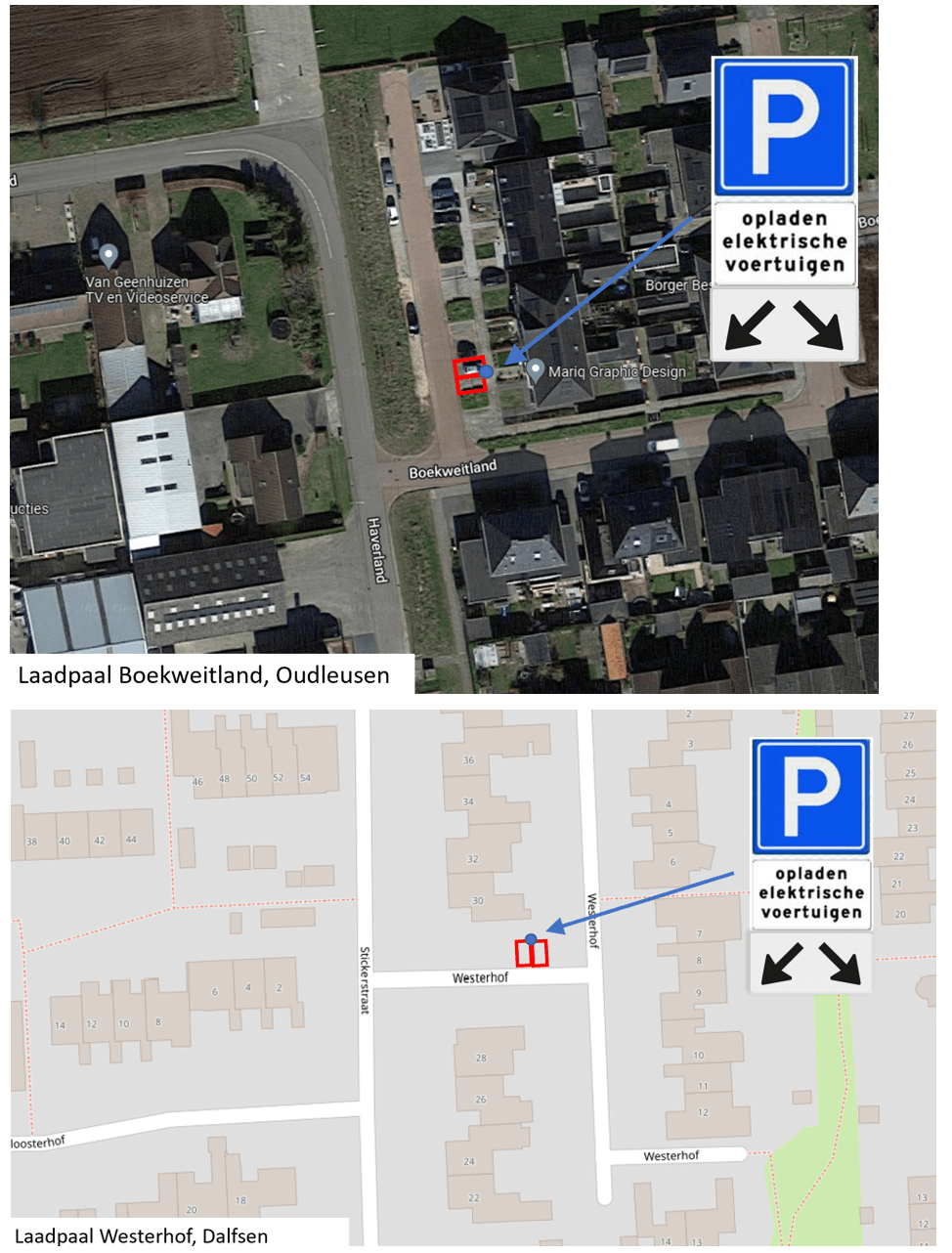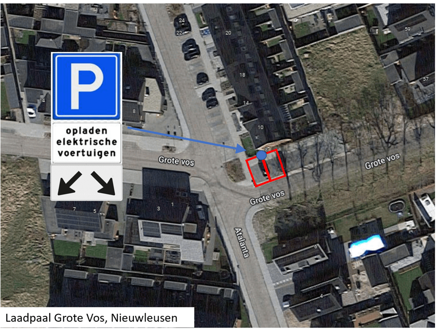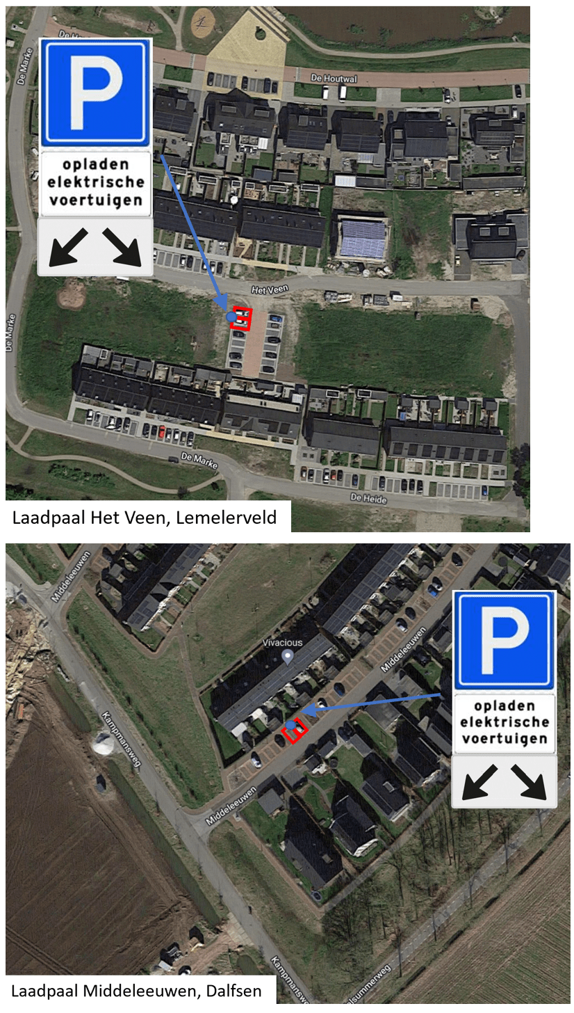 Het reserveren van twee parkeerplaatsen voor het opladen van elektrische voertuigen wordt uitgevoerd door middel van het plaatsen van de verkeersborden E4 van bijlage 1 van het RVV 1990 met een onderbord met de tekst ‘opladen elektrische voertuigen’ en een onderbord dat aanduidt dat het verkeersbord van toepassing is op de twee nabijgelegen parkeerplaatsen. Conform situatieschetsen wordt de maatregel uitgevoerd.
