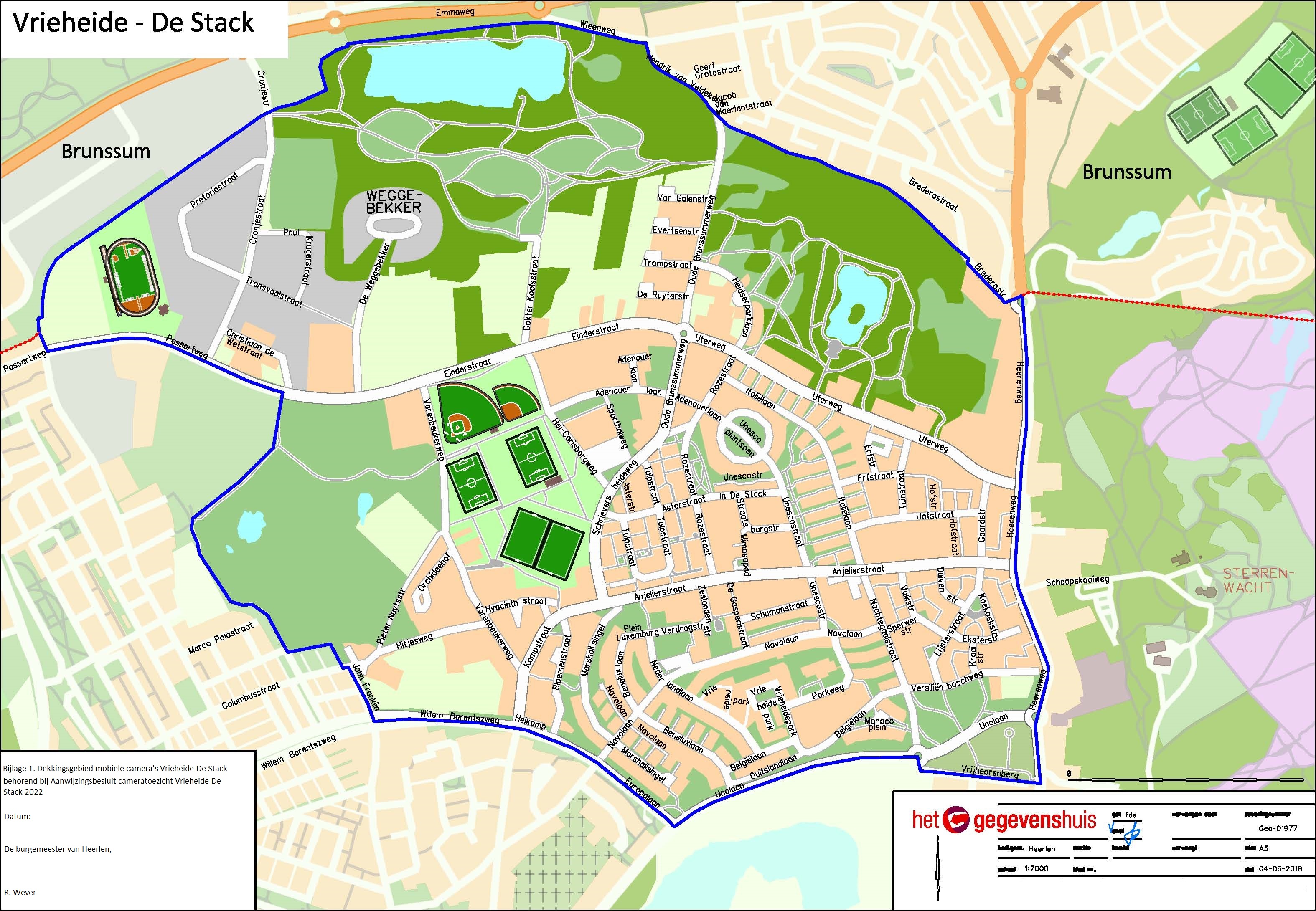 De wijk Vrieheide-De Stack, begrensd door de Unolaan, Vrijheerenberg, Heerenweg, Brederostraat, Hendrik van Veldekestraat, Wieënweg, Cronjestraat, Passartweg, John Franklin-straat, Willem Barentszweg en Europalaan zoals weergegeven op bijgaande overzichtskaart, inclusief de genoemde straten voor zover deze tot de gemeente Heerlen behoren, aan te wijzen als gebied waar, met ingang van de inwerkingtreding van dit besluit, door middel van verplaatsbare camera’s voor de duur van maximaal vijf (5) jaar, toezicht wordt gehouden.