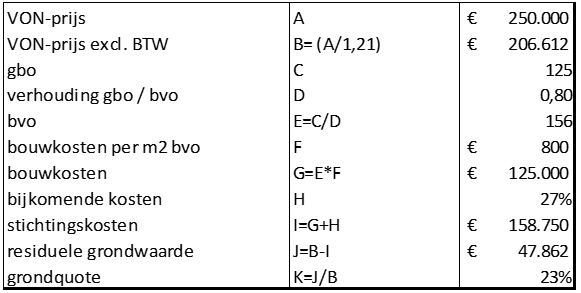 De VON-prijs (excl. btw) vermenigvuldigt met een grondquote geeft de te hanteren grondprijs.
