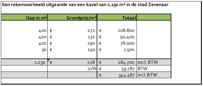 De grondprijs voor groenstroken bedraagt € 75,- per m². Hierbij wordt geen onderscheid gemaakt tussen stad Zevenaar of de kerkdorpen. Over deze grondprijs wordt overdrachtsbelasting geheven (momenteel 2% voor particuliere doeleinden, zie ook de uitzonderingen in onderstaande voetnoot).