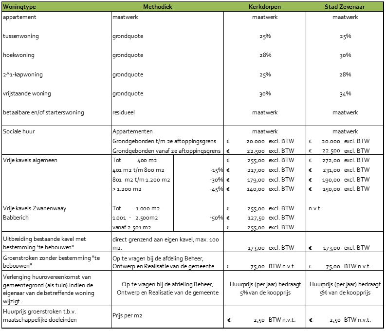 Ad 5. Vaste grondprijzen zijn vaak gebaseerd op de comparatieve methode. Voor gemeenten met een beperkte bouwopgave is een vaste grondprijs eenvoudig te hanteren. Daarbij geeft dit duidelijkheid over grondprijzen bij het bestuur, de Raad en haar inwoners.