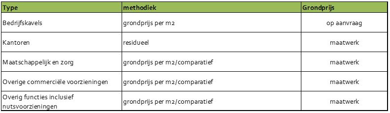 De grondprijzen zijn bepaald met de residuele grondwaardemethode en betreffen bouwrijpe grond. Jaarlijks geven Burgemeester & Wethouders inzicht in de te hanteren methoden en prijzen in de grondprijzennota, waarbij tevens rekening wordt gehouden met Europese wet- en regelgeving. Afwijkingen van het grondprijsbeleid zijn voorbehouden aan het college mits deze vallen binnen de kaders van de desbetreffende vastgestelde grondexploitatie.