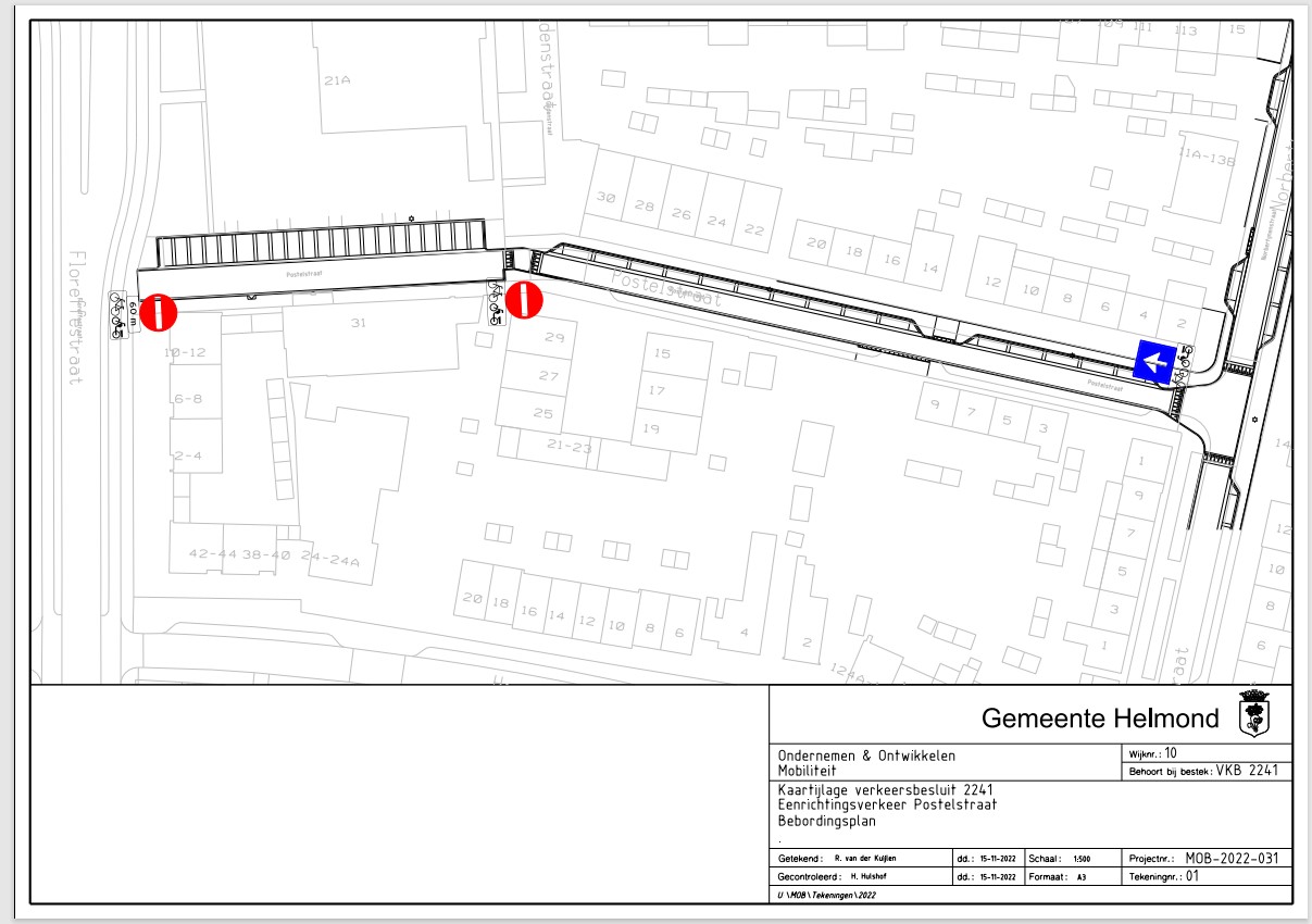 Verkeersbesluit voor het instellen van eenrichtingsverkeer en het inrichten van een wegversmalling aan de Postelstraat tussen de Gildenstraat en de Norbertijnenstraat te Helmond