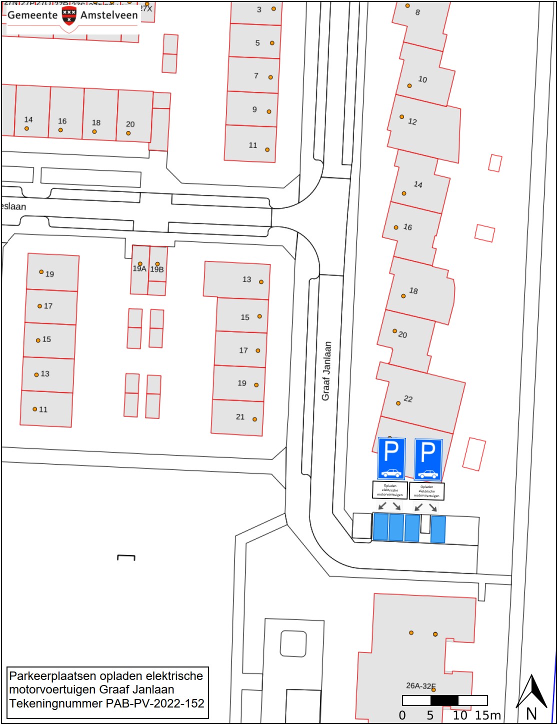 Burgemeester en wethouders van Amstelveen besluiten om in de Graaf Janlaan vier parkeerplaatsen aan te wijzen als parkeerplaats voor het opladen van elektrische motorvoertuigen. De parkeerplaatsen mogen alleen gebruikt worden voor het opladen van deze elektrische motorvoertuigen.