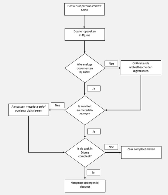 Registreren archiefbescheiden en bijbehorende controles: De nieuwe/ontbrekende gedigitaliseerde archiefbescheiden worden geregistreerd in Djuma bij de bestaande zaak. Door middel van de registratie van bijhorende metadata zijn de archiefbescheiden vindbaar en wordt de registratiekwaliteit geborgd.
