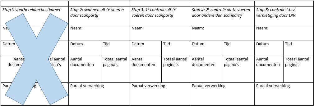 Artikel 26b sub 9 van de Archiefregeling verplicht de zorgdrager een beschrijving op te nemen van het proces van vernietiging van de vervangen archiefbescheiden.