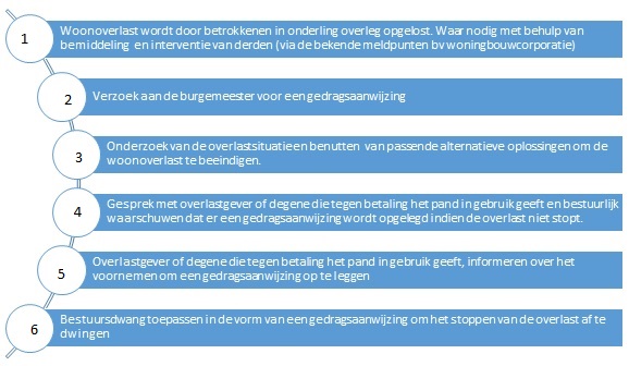 De volgende fasering wordt in beginsel gehanteerd bij het behandelen van woonoverlast en in het bijzonder van een verzoek voor het opleggen van een gedragsaanwijzing.