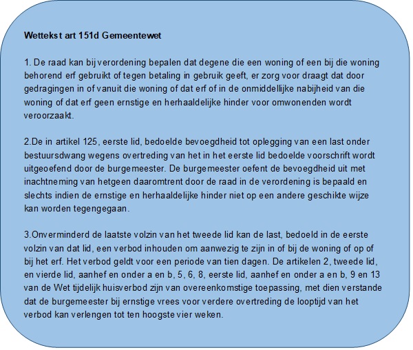 Per 1 juli 2017 is de Wet Aanpak Woonoverlast in werking getreden door toevoeging van art 151d aan de Gemeentewet (zie bijlage 1). Deze wet biedt de lokale overheid een aanvullend instrument in de aanpak van woonoverlast. Het wetsartikel bepaalt dat de gemeenteraad in een verordening aan de burgemeester de bevoegdheid kan geven om aan een veroorzaker van woonoverlast en/of degene die tegen betaling het pand in gebruik geeft een gedragsaanwijzing te geven. Met die bevoegdheid kan door de burgemeester bestuursrechtelijk worden opgetreden als er voor omwonenden ernstige en herhaaldelijke hinder wordt veroorzaakt in of vanuit een woning of in de onmiddellijke nabijheid van de woning. Het optreden kan in de vorm van een last onder dwangsom of een last onder bestuursdwang. Indien nodig kan er een, in de tijd begrenst, verbod om aanwezig te zijn in de woning c.q. op het erf van de woning worden opgelegd.