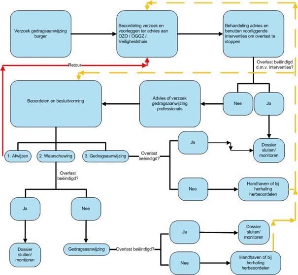 Bij de behandeling van verzoeken aan de burgemeester om gebruik te maken van de bevoegdheid om een gedragsaanwijzing op te leggen wordt gebruik gemaakt van de bestaande reguliere werk- en overlegstructuren en instrumenten die worden ingezet bij het bestrijden van woonoverlast.