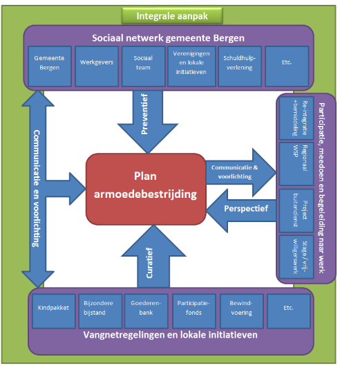 De visie 'iedereen aan het werk' wordt nadrukkelijker ingezet. We bedoelen daarmee dat we mensen die geen (vrijwilligers)werk hebben, actief begeleiden naar een plek waar ze ritme, structuur en werkervaring geboden wordt. We hebben binnen de gemeente Bergen de laatste 5 jaar bijzonder goede resultaten geboekt in het toe leiden van mensen vanuit de uitkering naar werk. Dit hebben bereikt door een de werkzoekenden uit Bergen ondersteuning te bieden bij het opdoen van relevante (werk)ervaring en hen te bemiddelen naar (lokale) werkgevers binnen ons netwerk. Deze kracht moeten we optimaal benutten voor de doelgroep die armoede ervaart. In een vroeg stadium ondersteuning aanbieden gericht op participatie en werk (deelname aan de maatschappij) bij de netwerkpartners.