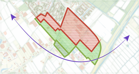 Afbeelding 1: begrenzing en mogelijke stedenbouwkundige invulling van het Achterweggebied en Vinkeveld-Zuid bij een gecombineerde ontwikkeling. De pijl markeert de stedenbouwkundige afronding van Noordwijk ‘Zuid-Oost’. Zowel de groene als rode zone valt binnen het totaal te ontwikkelen gebied. Het rode gebied is op dit moment voornamelijk bedoeld voor bebouwing, in het groene gebied zal een groene overgangszone worden gerealiseerd.