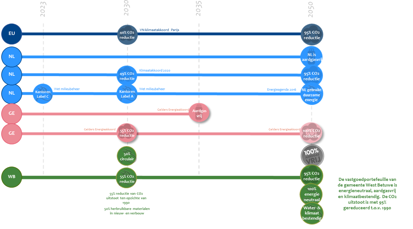 In 2050 is de vastgoedportefeuille van de gemeente West Betuwe onder aan de streep energieneutraal. Dit betekent dat, berekend over het totaal van de portefeuille, er evenveel energie wordt opgewekt als verbruikt (gebouwgebonden en gebruikersgebonden energievraag). Ieder gemeentelijk gebouw is in 2050 energieneutraal. De doelstelling wordt binnen de gemeentelijke perceelgrenzen van het gebouw ingevuld. Mocht dit door wet- en regelgeving niet mogelijk zijn – zoals bij bijvoorbeeld monumenten – kan het energiegebruik binnen de gemeentegrenzen gecompenseerd worden. De totale uitstoot in CO2 is met 95% gereduceerd ten opzichte van 1990. De gemeente heeft in 2030 de CO2-uitstoot van haar vastgoedportefeuille met 55% gereduceerd. Hierbij volgt de gemeente West Betuwe de route van het Nationale Klimaatakkoord en het Klimaatakkoord van Parijs, maar ook van het Gelders Energieakkoord en haar eigen Coalitieakkoord.