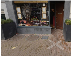 Naast het eethuis is een zebrapad. Dit zorgt voor veel voetgangers op het trottoir.