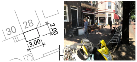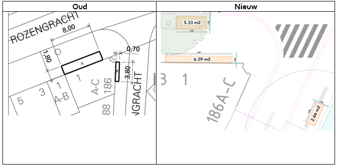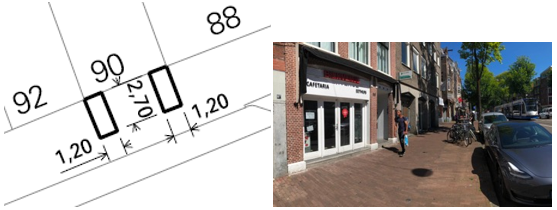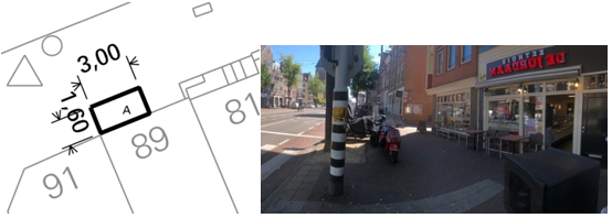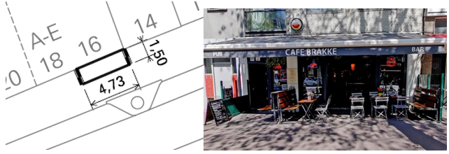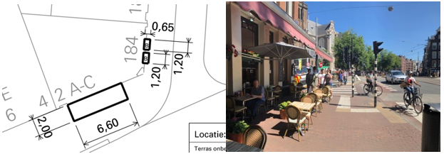 In de onderstaande tekeningen zijn de terrassen ingetekend op basis van de door stadsdeel Centrum vastgestelde uitgangspunten. In de afbeeldingen wordt het nieuwe terras weergegeven in oranje. Daarnaast staat de oppervlakte van het terras in het oranje vlak benoemd. De dieptes van de terrassen die worden genoemd zijn maxima.