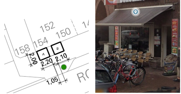 Grillroom Shoarma ‘’Hilal’’ heeft een locatie op nummer 154. Het terras is 2 m diep. De doorloopruimte wordt verder beperkt door een boom en fietsnietjes tegenover de grillroom.
