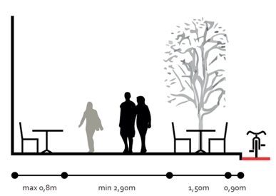 Op basis van de inventarisatie van de huidige situatie volgt dat de meeste terrasvergunningen moeten worden aangepast in de nieuwe herinrichting waarin rekening gehouden worden met een vrije doorloopruimte van 3,60 meter, en waar nodig met een minimale doorloopruimte van 2,90 meter (zie onderstaande uitgangspunten).