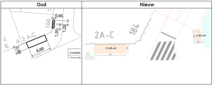 De huidige vergunde ruimte is zoveel als mogelijk in het ontwerp opgenomen. Dit lukt niet op alle plekken. Bij de hoeken is niet altijd – voldoende – ruimte in de servicestrook vanwege de zijstraat en de bocht in de rijweg. Hieronder een overzicht van de ondernemers die minder terrasruimte krijgen dan hun huidige vergunde oppervlak.