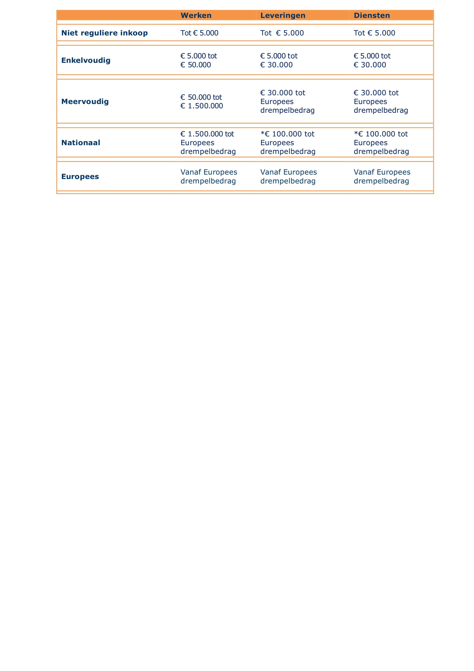 Boven de (Europese) drempelbedragen zal de Gemeente in beginsel Europees aanbesteden, tenzij dit in een bepaald geval niet nodig is op grond van de geldende wet- en regelgeving.